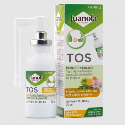 Juanola Spray Tos es un producto sanitario, en formato spray bucal, listo para llevar, con própolis, miel, altea, aloe vera y líquen de Islandia.