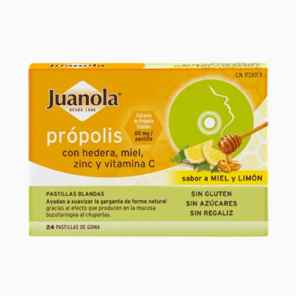 Juanola Própolis sabor miel y limón es un producto alimenticio en forma de pastillas de goma blandas para chupar, con extracto de própolis,