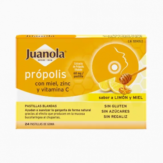 Juanola Própolis sabor limón es un producto alimenticio en forma de pastillas de goma blandas para chupar, con extracto de própolis, miel, zinc