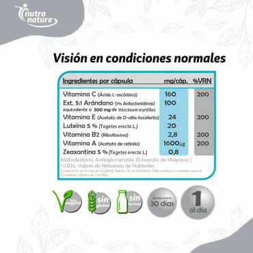 Cápsulas con Luteína, Zeaxantina, Arándano, Vitamina A y Vitamina B2 que contribuyen al mantenimiento de la visión en condiciones normales.