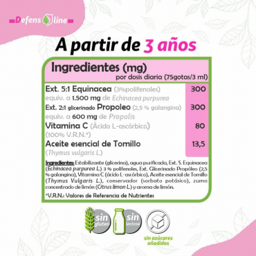 Fórmula con extractos titulados de equinacea y propóleo, aceite esencial de tomillo y vitamina C, que contribuye al funcionamiento normal