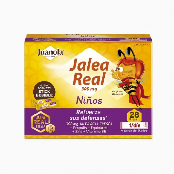 Juanola Jalea Real Niños es un complemento alimenticio en formato de sticks bebibles elaborados a base de jalea real fresca titulada al 2% en HDA,