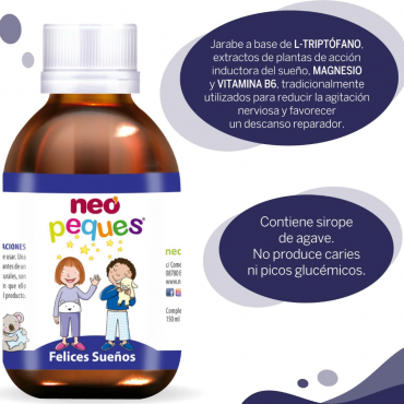 Neo Peques Felices Sueños combina L-Triptófano, extractos naturales, Magnesio y Vitamina B6 para reducir la agitación nerviosa y