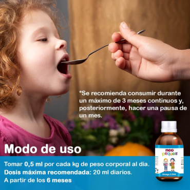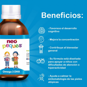 Neo Peques Omega 3 DHA apoya el desarrollo cerebral y cognitivo de tu peque desde temprana edad gracias al DHA. Además, favorece
