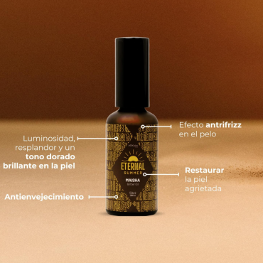 resplandor y un tono dorado brillante, logrando un aspecto bronceado y sublime en la piel. En el cabello, combate el friz, elimina la sequedad y la