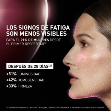 Después de 28 días, los resultados se intensifican con un aumento del +51% en la luminosidad y una mejora del +42% en la uniformidad del tono de la piel.
