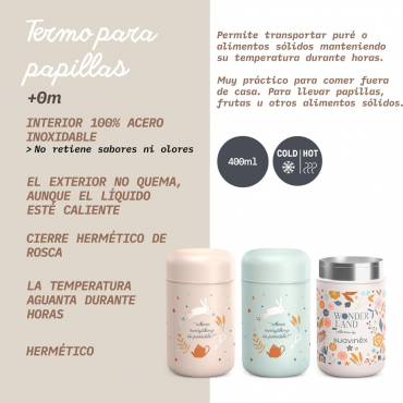 Este termo para papillas permite transportar los purés o alimentos del bebé manteniendo su temperatura durante varias horas.