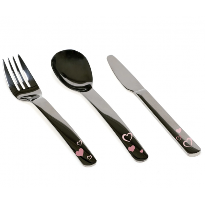 Este set de tres cubiertos infantiles en acero inoxidable (cuchara, tenedor y cuchillo) está pensado para los niños un poquito más mayores que ya