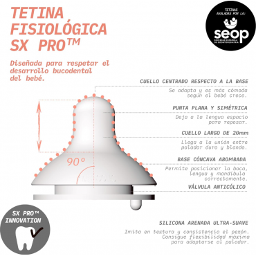 Suavinex SX生理破伤风尊重婴儿口腔的发育。SX Pro生理破伤风使舌头保持在与婴儿母乳喂养时相同的自然位置。