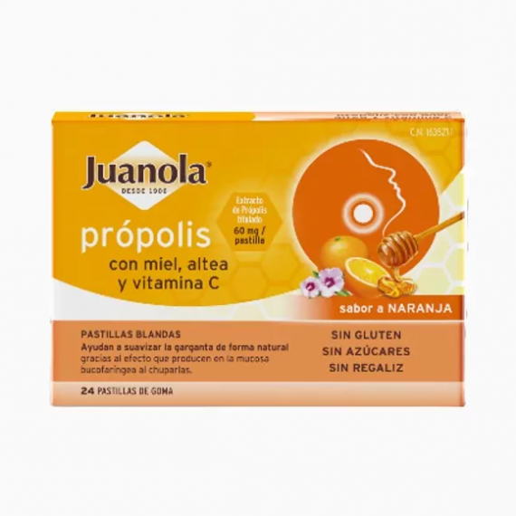 Juanola Propolis橙味是一种软性口香糖形式的食品,含有蜂胶提取物,茶,蜂蜜和维生素C,有助于软化喉咙自然,因为当你吮吸它们时,它们会对咽咽粘膜产生影响。