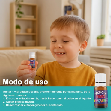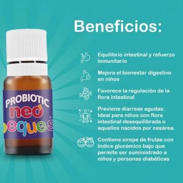 Neo Peques益生菌是一种益生元和益生元混合的食物补充剂,有助于调节肠道菌群,加强免疫系统,特别是在腹泻或消化紊乱的情况下。