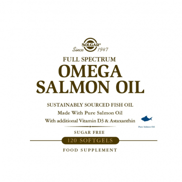 Solgar Full Spectrum Omega三文鱼油®含有广泛的脂肪酸,来自海洋之友认证的纯可持续来源的北欧三文鱼油。